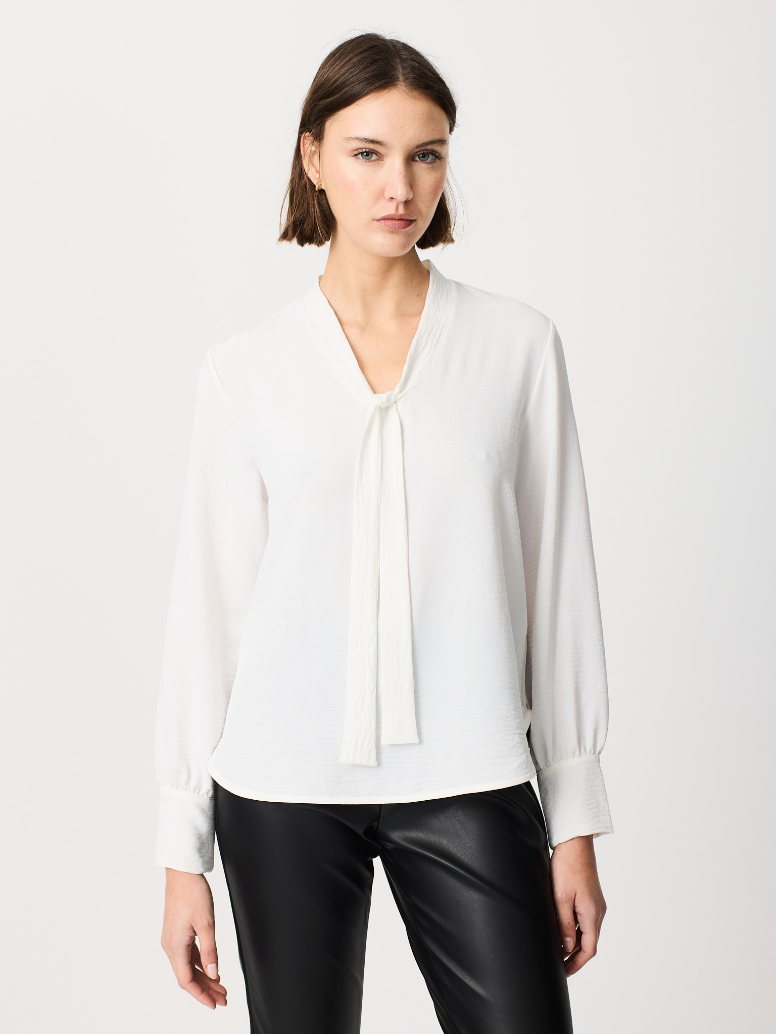 Blusa Escorpión blanca con lazo al cuello (pussy-bow), manga larga con puño ancho y caída ligera y fluida. Aporta elegancia inmediata para oficina, entrevistas o cenas; combina con sastrería, denim o falda midi. Te verás pulida sin esfuerzo.