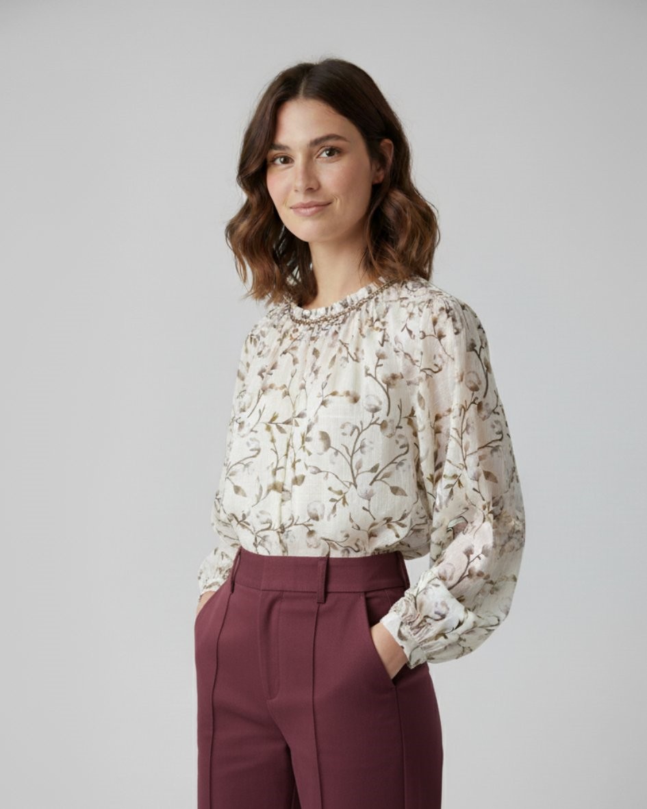 Blusa indi & cold de inspiración boho con estampado floral en base cruda. Cuello fruncido con detalle trenzado, manga larga y ligero efecto arrugado. Corte suelto con frunce sutil en la cintura que aporta movimiento. Fresca y versátil para vaqueros, faldas midi o sastrería ligera.