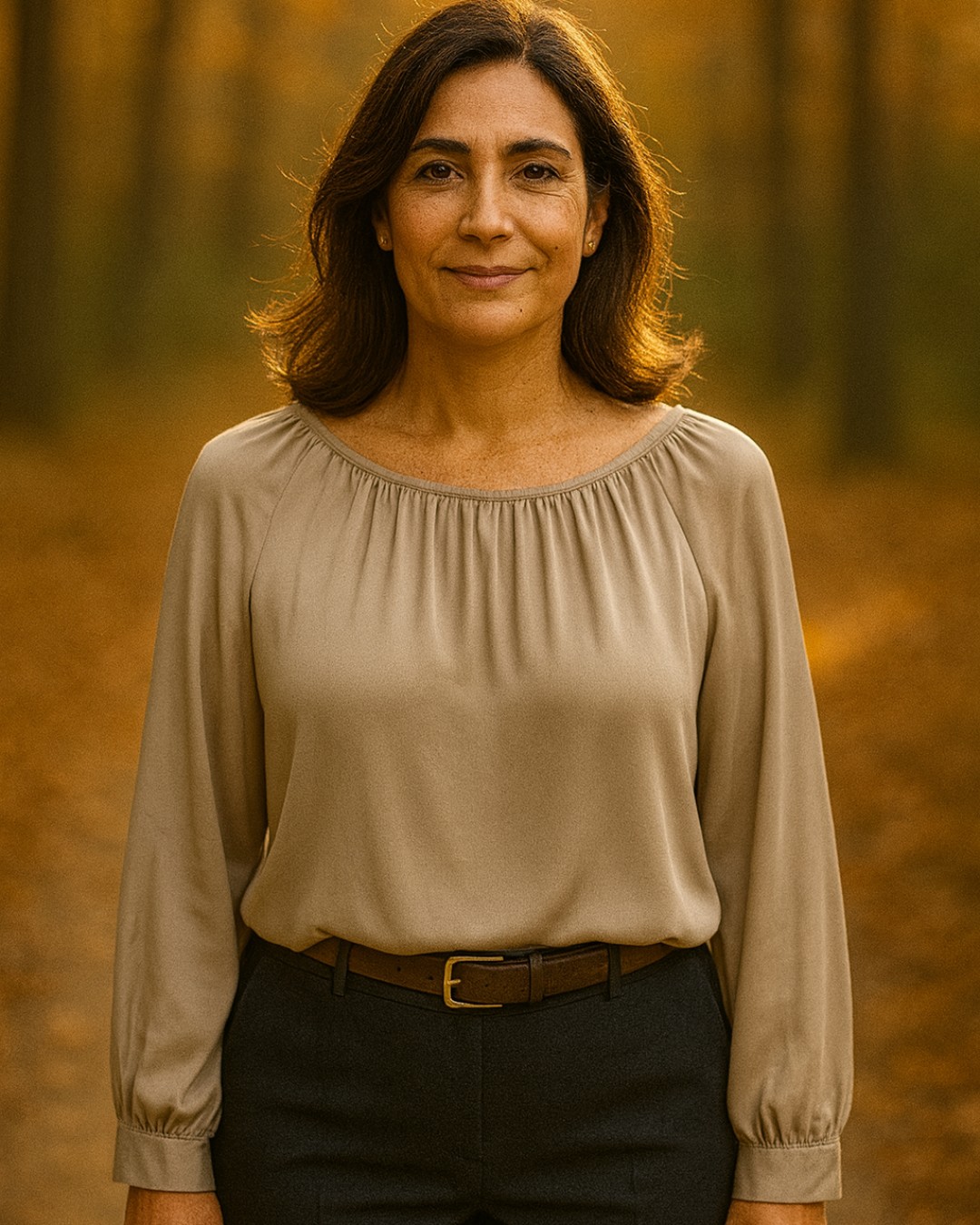 Blusa fluida beige topo con cuello redondo fruncido, abertura trasera con botón y manga larga terminada en puño con pequeño volante. Caída suave y tacto sedoso que aporta movimiento y brillo discreto. Ideal para oficina con sastre o para diario con vaquero.