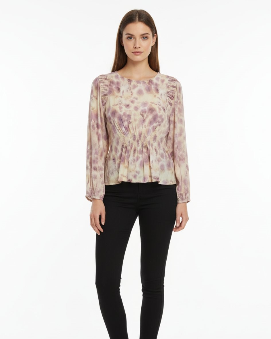 Blusa fluida de Indi & Cold en viscosa 100% con estampado acuarela en tonos malva y arena. Cuello redondo con abertura trasera, manga larga abullonada y detalle de nido de abeja frontal que recoge suavemente y define la zona de la cintura. Caída ligera y tacto suave, ideal para el día a día o para elevar un vaquero con un punto sofisticado.