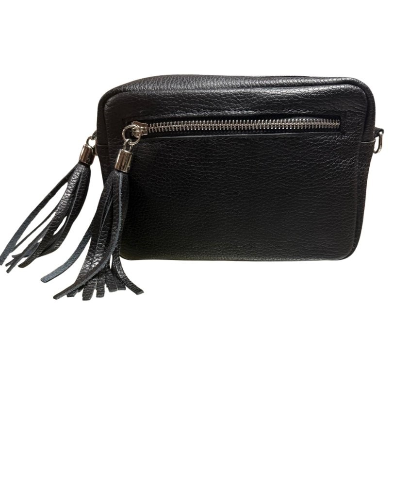 Tu básico elegante de todos los días. Bandolera negra de Velia Leather en piel graneada con borlas laterales, bolsillo exterior con cremallera y correa regulable para llevar al hombro o cruzado. Ligera, resistente y con herrajes metálicos que suman brillo discreto. Combina con vaqueros, working looks y noche.