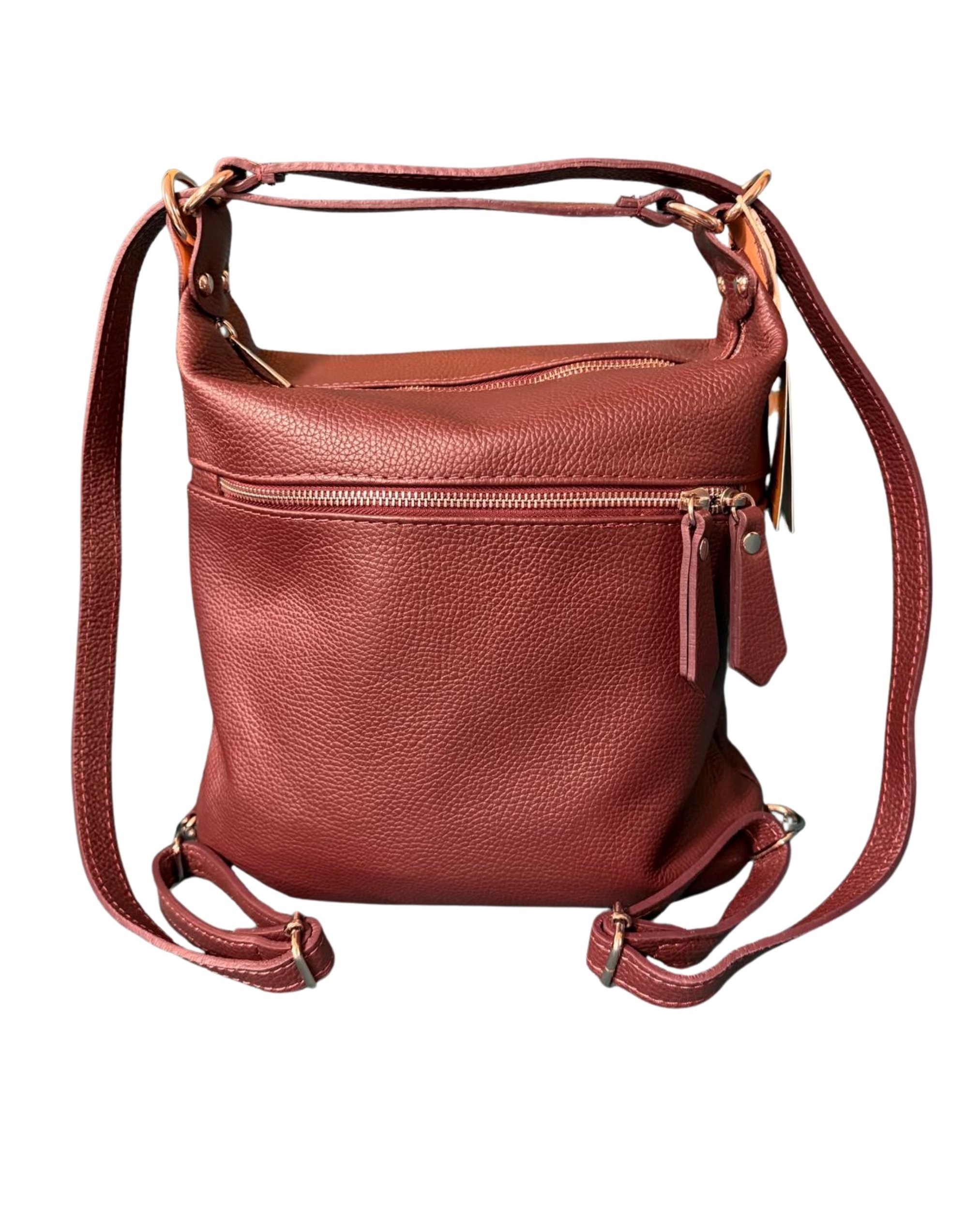 Libertad con estilo. El bolso-mochila granate de Velia se transforma en segundos de bandolera a mochila gracias a sus correas regulables y anillas inferiores. Confeccionado en piel graneada suave, incluye gran apertura superior con cremallera, bolsillo frontal con doble tirador para lo inmediato y herrajes en tono dorado. Ligero y espacioso: perfecto para agenda, botella pequeña y esenciales. Un tono granate que eleva looks casual, de oficina o fin de semana.