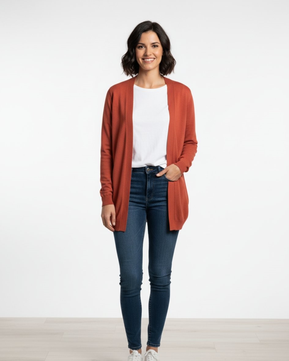 Cárdigan largo abierto en punto fino. Silueta relajada, manga caída con puño canalé y caída fluida que acompaña el movimiento. Ligero, suave y fresco gracias a la mezcla de viscosa y poliamida.