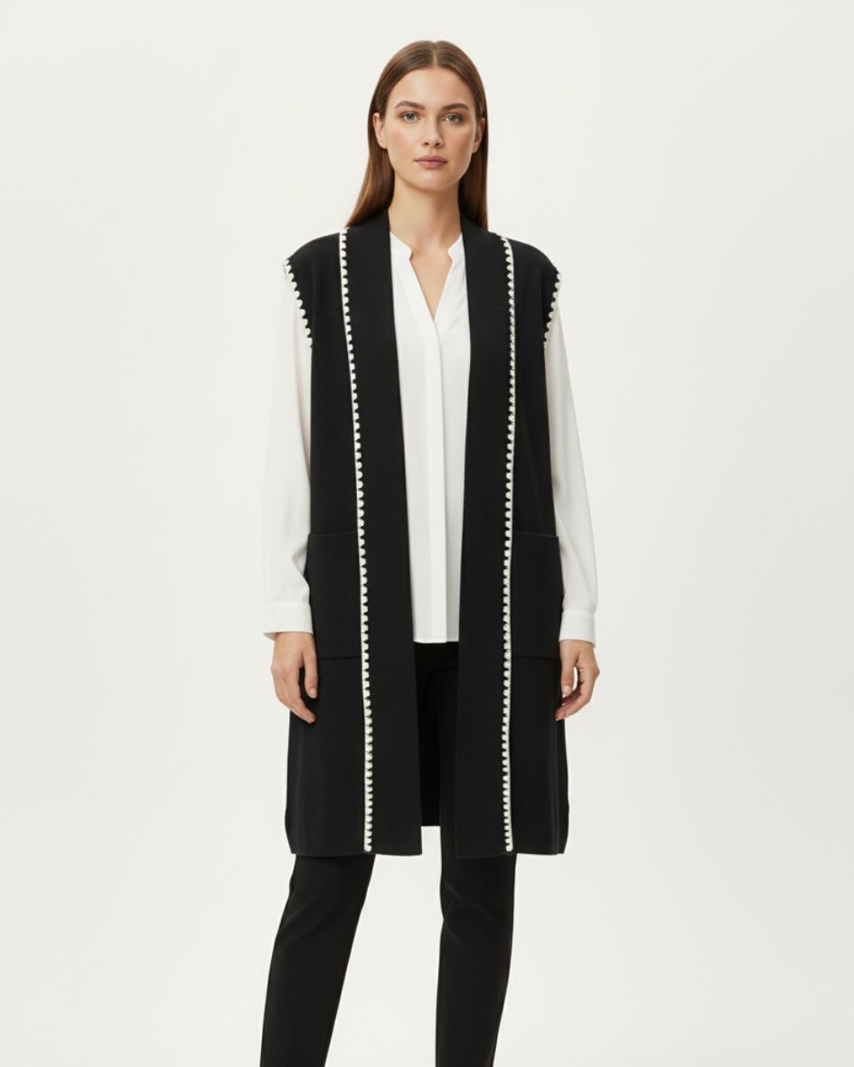 Chaleco largo de punto con ribete crudo en contraste, cuello tipo solapa y apertura delantera. Corte recto con bolsillos y caída limpia. La mezcla suave y elástica lo hace cómodo, ligero y perfecto para superponer sobre camisas, jerséis finos o vestidos. Del trabajo al after con un gesto.
