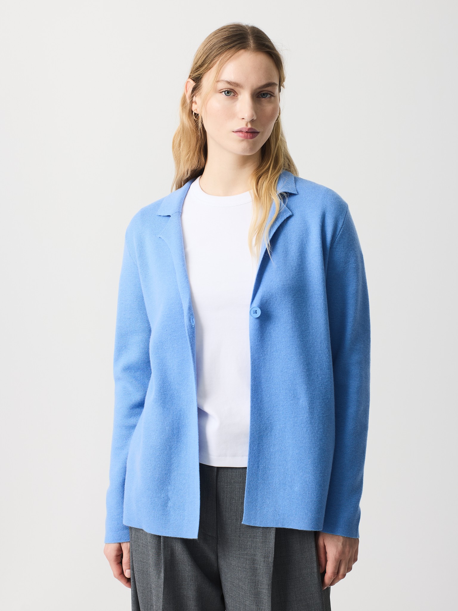 Chaqueta de punto azul con solapas, cierre de un botón y bolsillos vivos. Tejido suave con caída fluida; mezcla de fibras nobles (incluye cachemira y seda) que abriga sin pesar y aporta un acabado pulido. Una capa ligera que eleva vaqueros, vestidos o pantalón sastre.