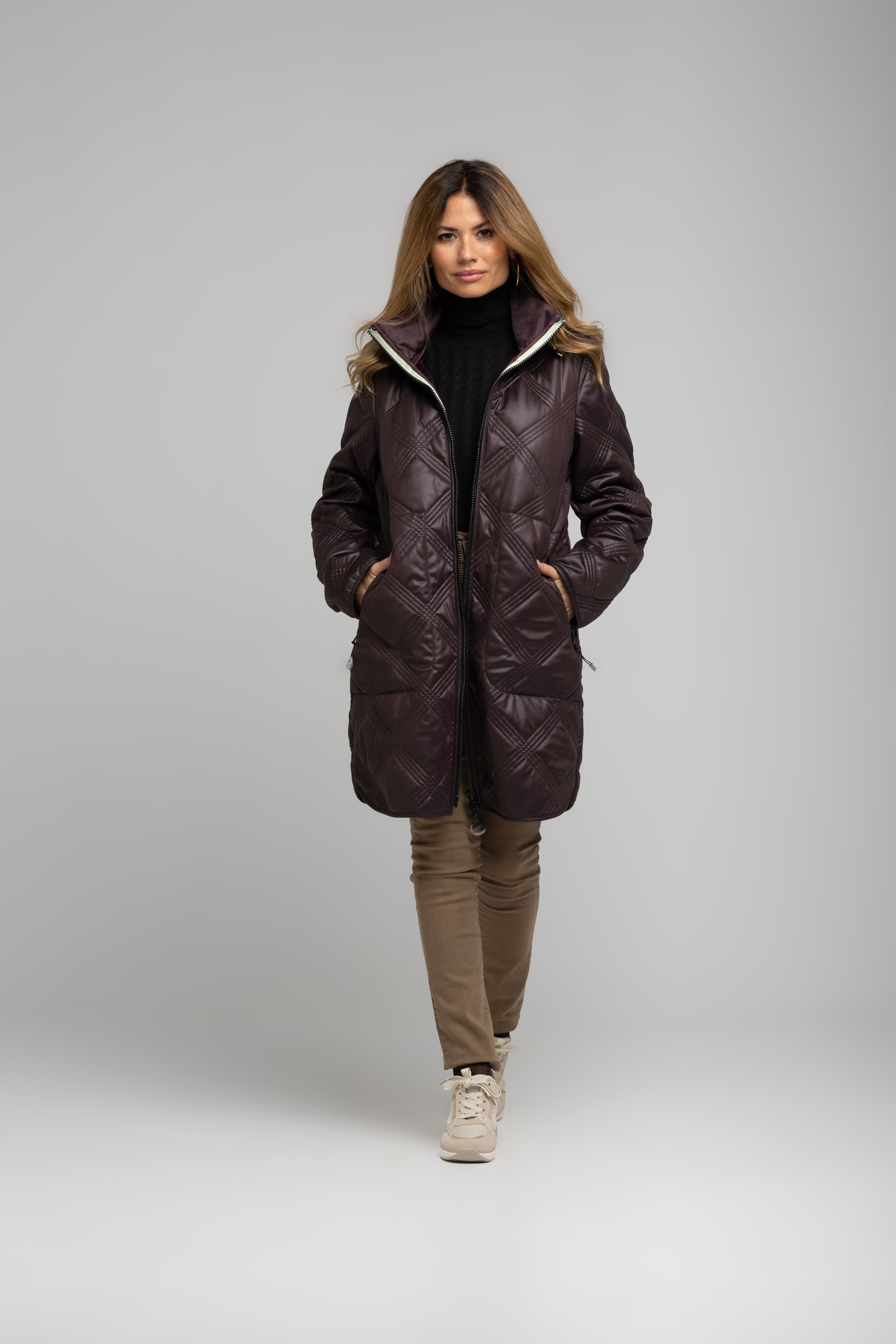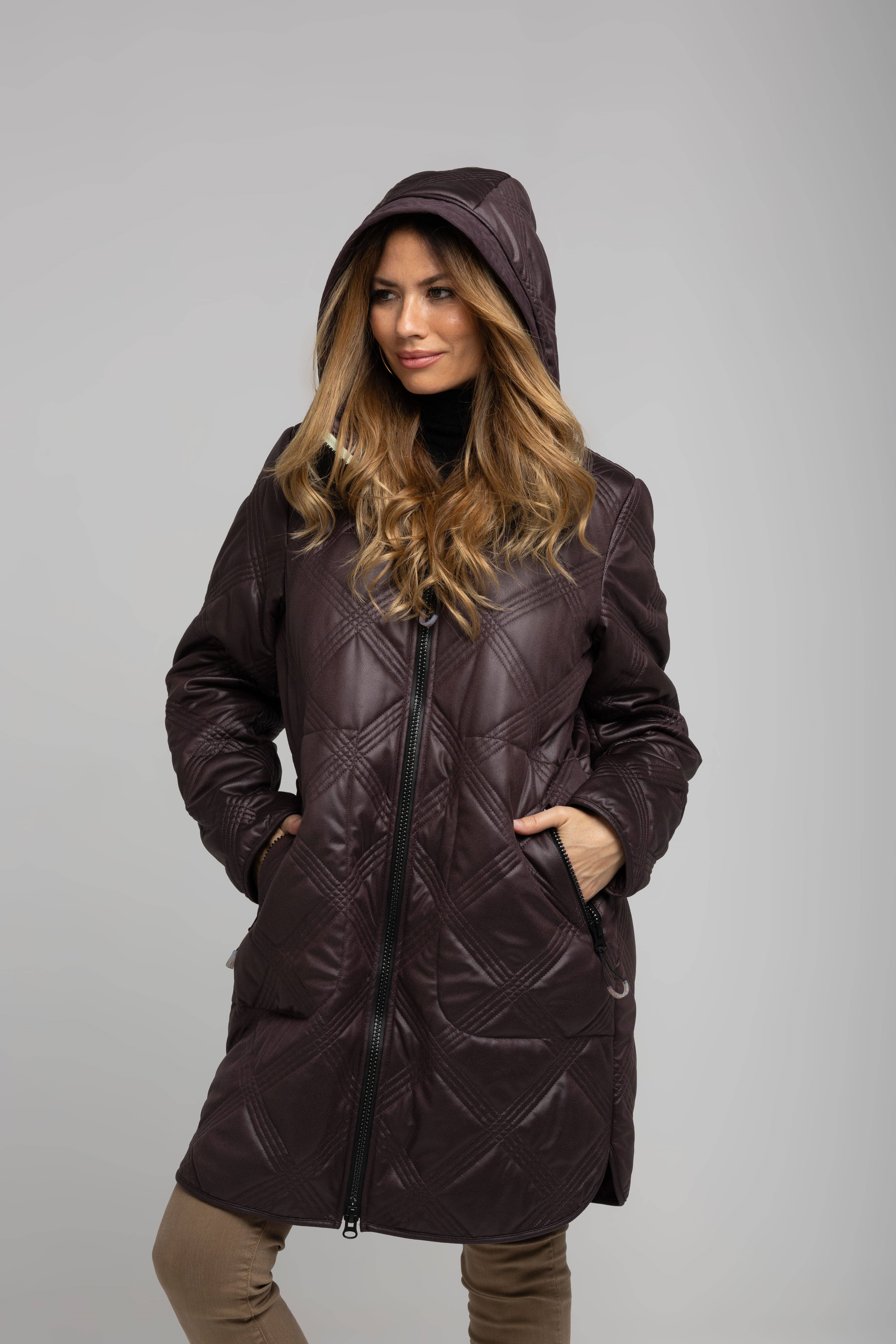 Abrigo ligero que abriga de verdad. Este chaquetón berenjena de Rever incorpora acolchado con patrón geométrico, capucha envolvente y bolsillos con cremallera para máximo confort urbano. Largo medio que estiliza y permite superponer punto o sastrería. Versátil para ciudad, trabajo y fin de semana.