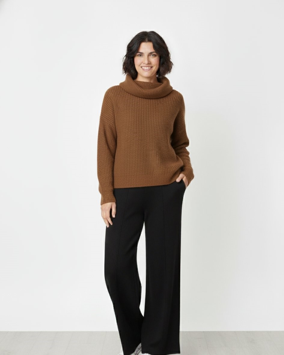 Jersey de punto marrón con cuello vuelto amplio tipo chimenea, manga larga y remate canalé en puños y bajo. Corte recto con caída suave: cálido, cómodo y fácil de combinar con vaquero, falda midi o sastre.