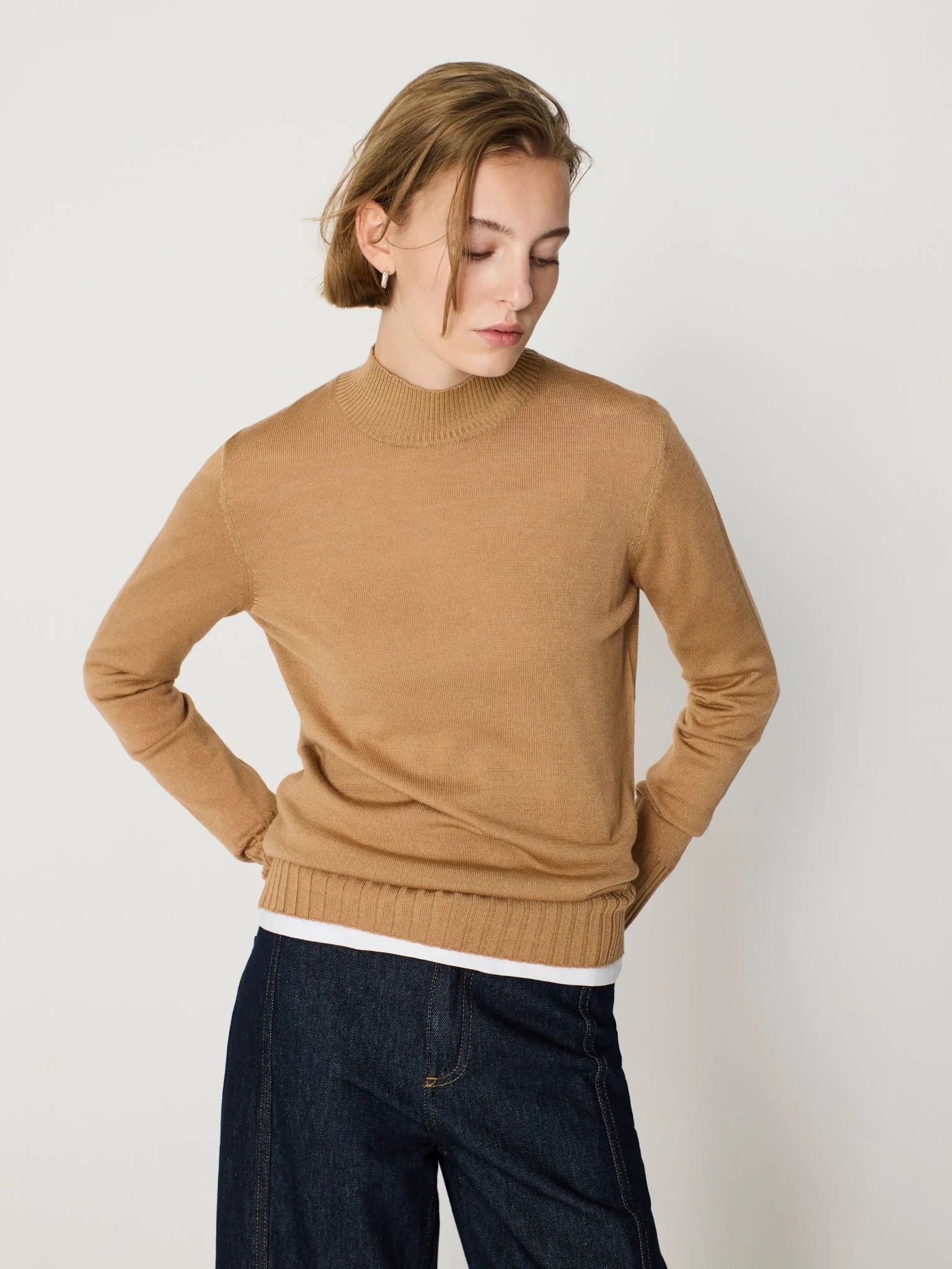 Jersey de punto con cuello alto tipo chimenea acanalado, manga larga y remates canalé en puños y bajo. Calidez ligera y tacto agradable gracias a su mezcla de lana y fibra acrílica. Fondo de armario fácil para llevar con vaquero, falda midi o sastre.