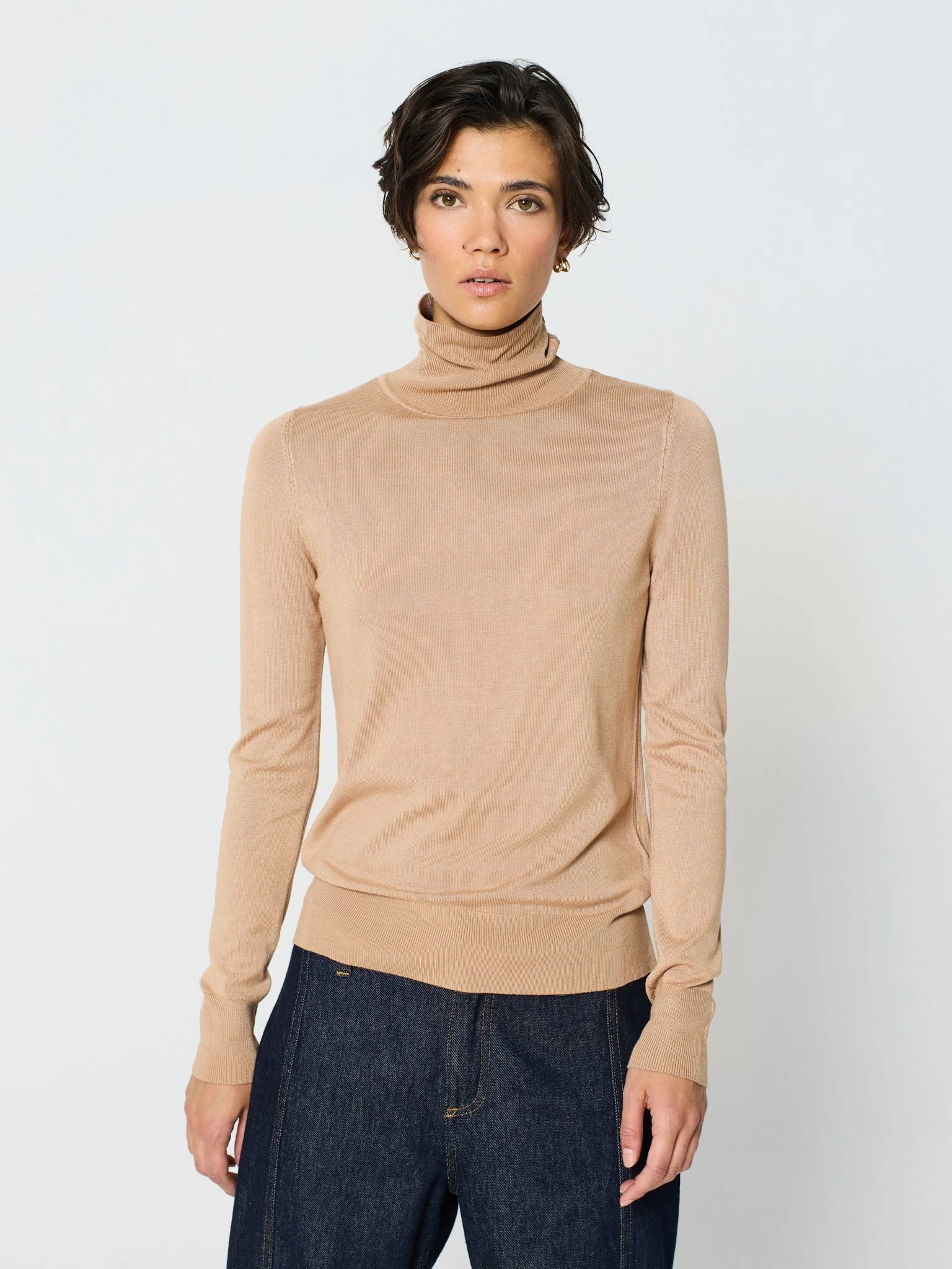 Jersey de punto fino con cuello chimenea suave, manga larga y remate canalé en puños y bajo. Tejido ligero y muy agradable gracias a su alto contenido en viscosa; cae limpio, no marca y funciona como base perfecta bajo americana o en looks relajados con denim o falda midi.
