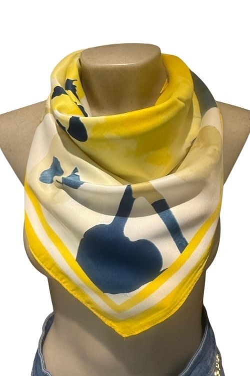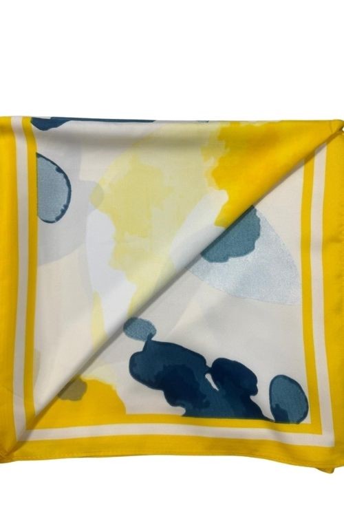 Ligero, suave al tacto y con un brillo sutil. Este pañuelo de Velia en poliéster sedoso combina un estampado gráfico en amarillo y azul con borde contrastado que enmarca el rostro. Su tamaño permite múltiples nudos: al cuello, en el pelo, como cinturón o anudado al bolso. Un toque de color que transforma cualquier look al instante.