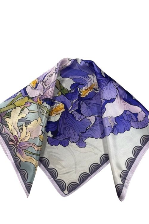 Pañuelo Velia de 100% seda (53 × 53 cm) con estampado floral en lila/azul con borde ondulado. Suave, ligero y luminoso: realza el rostro, eleva básicos y funciona en cuello, cabello, muñeca o asa del bolso. Perfecto para regalar y usar todo el año.