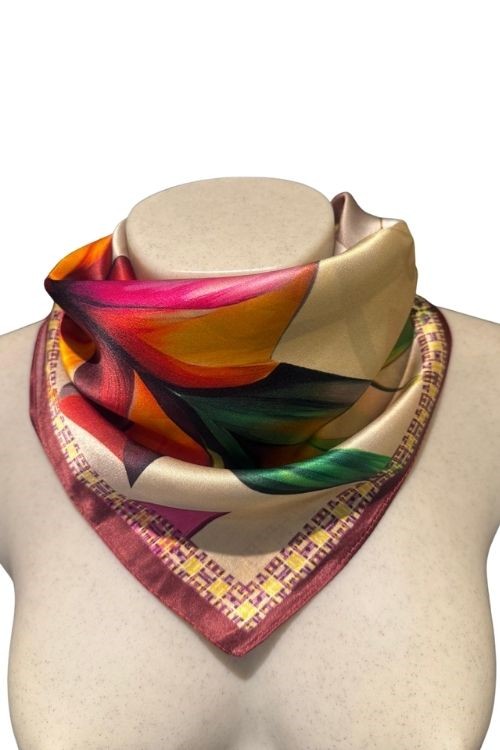 Pañuelo Velia de 100% seda (53 × 53 cm) con acabado satinado. Estampado floral multicolor sobre base beige y borde burdeos con motivo geométrico. Suave, ligero y brillante: aporta color al rostro y eleva cualquier look. Llévalo en cuello, cabello, muñeca o asa del bolso. Ideal para regalo.