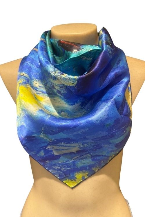 Ligero, suave y con brillo satinado. Este pañuelo 100% seda de Velia luce un estampado artístico en tonos azules que ilumina el rostro y eleva desde una camiseta básica a un vestido midi. Llévalo al cuello, en el pelo, como cinturón o anudado al bolso: un básico deluxe que transforma cualquier look al instante.