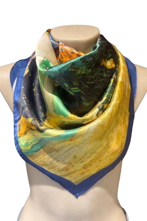 Ligero, suave y con brillo satinado. Este pañuelo de 100% seda de Velia luce un estampado artístico y borde contrastado que enmarca el rostro y eleva cualquier look. Llévalo al cuello, en el pelo, como cinturón o anudado al bolso: un toque sofisticado que transforma de inmediato denim, punto o sastrería.