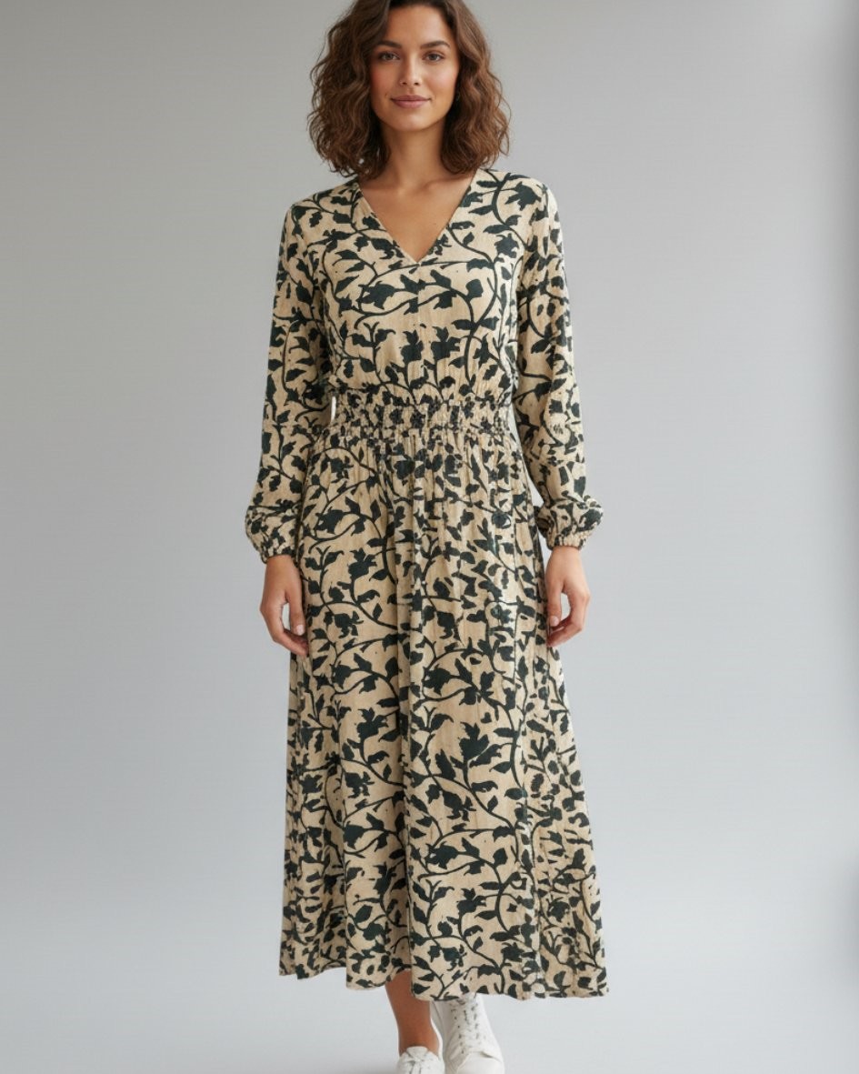 Vestido midi de Indi & Cold con estampado botánico sobre fondo crudo. Escote en V, hombro suave, manga 3/4 y cintura fruncida que define sin oprimir. Tejido fluido con caída ligera que acompaña el movimiento.