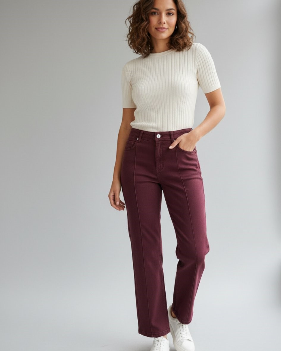 Pantalón de pernera recta-ancha con tiro medio/alto, cinturilla con trabillas y cierre de botón.